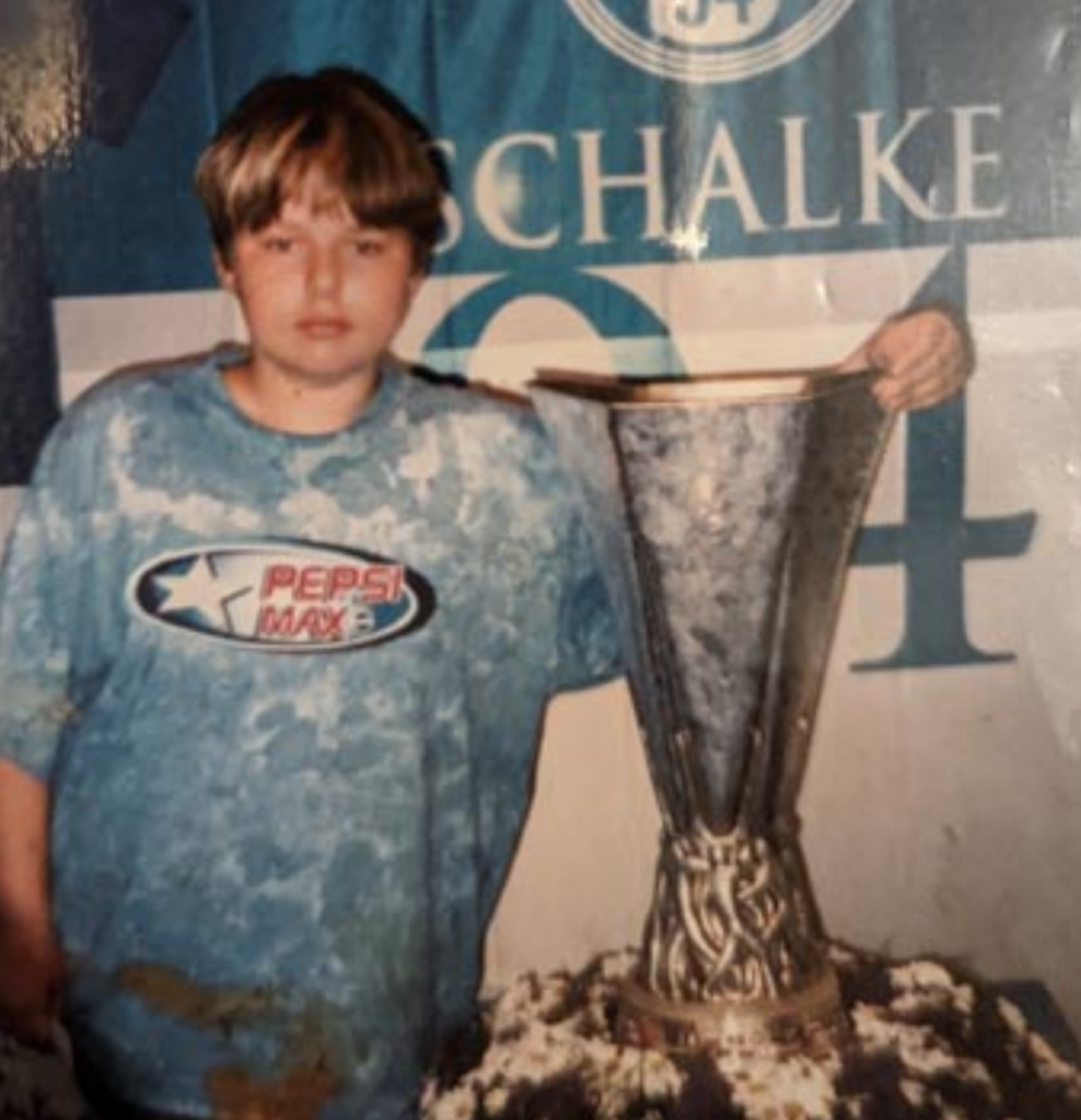 Nö, gar nicht. Null. In meinem Umfeld hatte niemand irgendwas mit Schalke oder Fußball am Hut. Ich wollte als Grundschulkind einfach im Verein kicken. Bei einem Sommerfest gab’s so ein Spiel, bei dem ich als Jüngster natürlich als Erster ausgeschieden bin. Zum Trost durfte ich mir aus einer Kiste einen Preis aussuchen – ich griff zur Schalke-Mütze.